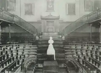 Meanwhile, Brechin architect John Henderson, a childhood friend of Davidson, was building the new church: one of the largest in the city and on one of the city's most awkward sites. The site in Greenside stretched from the upward plateau down a steep slope more than 10m high. The resultant building looked conventional from the front, but entered on an upper gallery level relative to the floor of the huge interior, with multiple galleries, more like a theatre than a church.[2] It held 1500 people.[3]