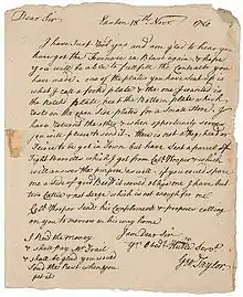 In 1776, the Continental Congress voted for independence on July 2 and adopted the Declaration of Independence two days later, on July 4.[10] Before the vote for independence, five of Pennsylvania's delegates, all Loyalists, were forced to resign. On July 20, Taylor was among the replacements appointed by the Assembly.[2] One of his first duties as a member of Congress was to affix his signature to the Declaration of Independence, which he did on August 2, along with most delegates. Of the 56 signers, he was one of only eight who were foreign-born, the only one to have been indentured, and the only one to hold the position of ironmaster.[11] Of the 56 signers of the Declaration, Taylor was one of the 41 who owned slaves.[12]