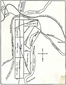 Young is also associated with several other lode mining claim location notices, for claims throughout the Highland Park area. One of his first locations is known as the 'Accidental' Lode Mining Claim. Additional lode mining claims situated in the Thumb Butte Mining District are the Isabella, Big Ben No. 1, Big Ben No. 2, Ellen M., Iona, Great Eastern, Last Chance (J.J. Fisher), Star, Lowry Hill, Lowry Cross, Ohio, Norman, Summit, Edgar, Alto, and Protection.[9] Prominent locators working with Young in the early 1900s included Thomas Smith, Frank Polson, Thomas C. Hill, Silas 'S.P.' Hill, James R. Lowry, James Samuels, Norman Hale, and Joseph Dougherty. The mining efforts here were all greatly served by the simple flag station with one switch, known by local miners as Summit Station,[12][14] otherwise known as Sierra Prieta on the Santa Fe, Prescott and Phoenix Railway. This was the main delivery system for the hauling of heavy equipment to the mining activity in the area.