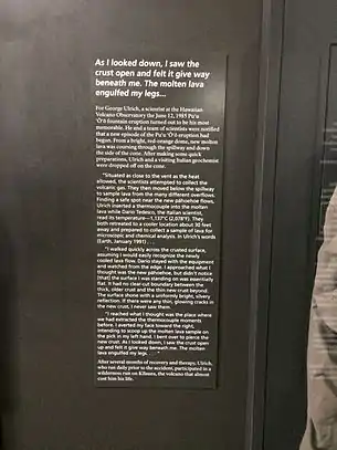 On 12 June 1985 while working for the United States Geological Survey as senior geologist of the Hawaiian Volcano Observatory, Ulrich fell through a thin crust of rock and was partially submerged in lava. He was quickly pulled out by a visiting Italian geologist, named Dario Tedesco,[2] but received second and third degree burns on both of his legs and lost a boot.[3] His protective equipment protected his legs from being burned beyond saving; according to Ulrich's account, he suffered no pain at the time as the intense heat of the lava immediately destroyed his nerve endings.[3][4][5] The remains of the gear he wore when exposed to the lava is currently on display at Hawai'i Volcanoes National Park.[3]
