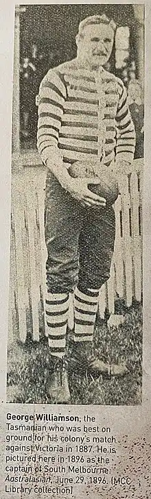 Originally from the Tamar Rowing Club Football Club in Launceston Tasmania, Williamson was named second-best player in Tasmania's first match on Victorian soil against the VFA at the MCG on May 21, 1887, before playing for Williamstown in the 1888-89 seasons (29-33 matches, 2 goals). Following accusations of bribery in a loss to lowly Footscray in 1889, Williamson crossed to the Tricolours for the 1890-91 seasons (30 games, 9 goals) then St Kilda in 1892 (14 games, one goal) and then playing back in Tasmania and at Albert Park Juniors before arriving at South Melbourne in 1895. He then went on to play 29 VFA games and kick one goal with South in 1895-96, captaining the Club in the latter season, the Club's last in the Association before the formation of the VFL, including the 1896 grand final loss to Collingwood. Williamson then played 12 VFL games with South without kicking a goal in 1897-98 before retiring at the age of 32.