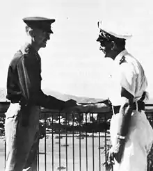 After the defeat of Japan, d'Argenlieu arrived in French Indochina on 31 October 1945. As High Commissioner of the French Far East Expeditionary Corps, his task was to restore the French colonial administration.[5] In 1946, he was promoted to vice-amiral d'escadre, and soon later to admiral. As High Commissioner in Indochina, he installed a puppet Autonomous Republic of Cochinchina in violation of the March 6 Ho–Sainteny agreement whilst the Viet Minh leadership was in negotiations in France, effectively beginning the First Indochina War.[6]