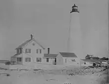 The original lighthouse was a cypress tower. It was destroyed by a storm in 1806. In 1812, a 72 feet (22 m) brick tower was built. A fourth-order Fresnel lens was installed in 1857. It was rebuilt and raised to 87 feet (27 m) in 1867 after suffering damage during the Civil War.[3]