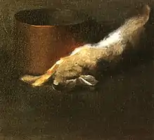 From 1905 to 1906, O'Keeffe was enrolled at the School of the Art Institute of Chicago, where she studied with John Vanderpoel and ranked at the top of her class.[2][13] As a result of contracting typhoid fever, she had to take a year off from her education.[2] In 1907, she attended the Art Students League in New York City, where she studied under William Merritt Chase, Kenyon Cox, and F. Luis Mora.[2] In 1908, she won the League's William Merritt Chase still-life prize for her oil painting Dead Rabbit with Copper Pot. Her prize was a scholarship to attend the League's outdoor summer school in Lake George, New York.[2] While in the New York City, O'Keeffe visited galleries, such as 291, co-owned by her future husband, photographer Alfred Stieglitz. The gallery promoted the work of avant-garde artists and photographers from the United States and Europe.[2]