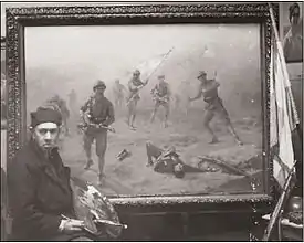 When the chaos had subsided, he was arrested and sentenced to death by a Turkish tribunal.[3] Luckily, the prison commandant allowed him to say goodbye to his family. With the assistance of his neighbors and the French Consul, he and his family were able to escape aboard a French ship that took them to Piraeus.[1] In 1925, he settled in Athens. He continued to paint military scenes from memory until 1928, after which he produced a variety of nudes, scenes of ruins and portraits, including one of Haile Selassie, who visited his studio shortly before becoming Emperor.