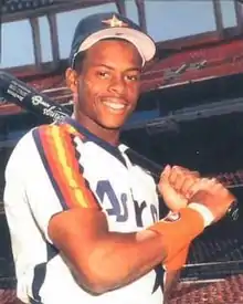 Traded by the Mets to the Houston Astros on September 1, 1984, for third baseman Ray Knight, Young made his major league debut with them on July 8, 1987. This made him the first Honduran to play for the Astros, and the only one until Mauricio Dubon joined the team in 2022. He showed promise by hitting .321 and stealing 26 bases for the Astros, finishing 5th in National League Rookie of the Year voting despite playing less than half a season with the major league club. Young's best season in the major leagues came the following year, 1988, when he finished 2nd in the NL with 65 steals. 1989 was a disappointment for Young offensively, although he finished 8th in the league in steals (34) and accomplished a rare defensive feat by recording 412 putouts with only one error and adding 15 outfield assists.