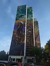 In October 2021, a mural of Geralt was painted on the side of a high-rise building in Łódź. Spanning three 70-meter-high walls on a 26-floor apartment block and covering almost 2,000 sq/m, it is the largest mural in Poland and one of the largest in the world. The mural has been inspired by an 1818 painting Wanderer above the Sea of Fog by German Romantic-era artist Caspar David Friedrich.[33][34]