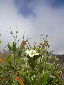 This plant is a shrub usually growing one or two meters tall but known to reach three. The flowers may be purple, pink, or white with purple veining and purple centers. The plant grows in forest and grassland habitat on the upper slopes of Haleakalā, in a subalpine climate. There are probably no more than 3000 individuals left.[2]