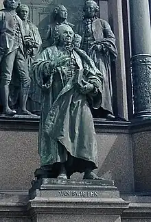 Van Swieten was a precocious student, finishing Latin school at the age of 12, around the time he became an orphan on 8 July 1712.[5] His father had appointed two friends as guardians, Adriaan Duyvens and Arnold Coops, and, when in Leiden, Van Swieten would live at Coops' house until 1727. He had already enrolled at Leiden University to study philosophy, though at the age of 14, he studied a few months in Leuven (September 1714 – January 1715) and from 1715 he set his mind on pharmacy. Between November 1715 and December 1716 he was a resident pupil of the pharmacist Laurens Tatum in Amsterdam, breaking of this education when he contracted smallpox.[6] Back in Leiden he enrolled at the University again and became a resident pupil with the pharmacist Nicolaas Stam, whose father had introduced Herman Boerhaave to chemistry. After three years, in 1720, he became a pharmacist; the following 5 year he not only ran a pharmacy, but also studied medicine at Leiden University. Here he almost exclusively followed classes by Herman Boerhaave and Bernhard Siegfried Albinus.[7] With Albinus as his advisor, he obtained his medical doctorate in July 1725 with a dissertation on the structure and function of arteries (De arteriae fabrica et efficacia in corpore humano).[8]