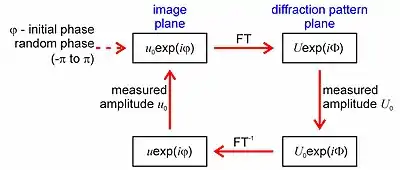 The Gerchberg–Saxton (GS) algorithm is an iterative phase retrieval algorithm for retrieving the phase of a complex-valued wavefront from two intensity measurements acquired in two different planes.[1] Typically, the two planes are the image plane and the far field (diffraction) plane, and the wavefront propagation between these two planes is given by the Fourier transform. The original paper by Gerchberg and Saxton considered image and diffraction pattern of a sample acquired in an electron microscope.