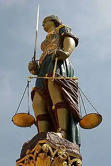 While the sword and scales are traditional attributes of Iustitia, the Bernese statue's blindfold is a novelty;[11][13] only later did it become a common element in personifications of Justice and a general symbol for the principle of equality before the law.[11] The blindfold implies that justice ought to be done without respect to rank or standing; that a just verdict is arrived at through introspection rather than with a view to outward looks.[11] Gieng's Iustitia is a symbol of republican justice, and was a forceful public reminder of the Bernese Republic's authority through law.[11]