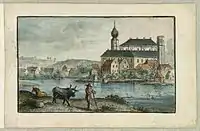 Lahde's "stambog" I-II, now kept in the Royal Danish Library, is a sort of guestbook which he notebooks he had with him on travels where people he met could write or make drawings. Most of the texts, drawings and gouachernes are by young artists from the Art Academy, most of them unknown today but the two books contain drawings by F. Camradt, C. D. Fritsch, Hans Hansen, Johan Ludwig Lund, Elias Meyer, C. F. Stanley, Runge, Friedrich, Bertel Thorvaldsen and C. W. Eckersberg. Most of the drawings are of imaginary landscapes but some are of topographically identifiable scenes or portraits.[2]