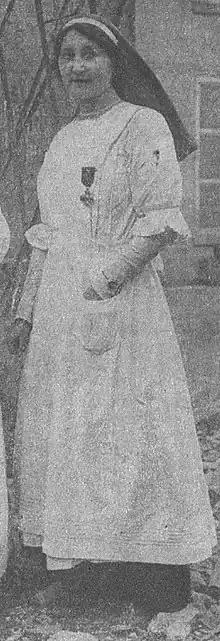 During the First World War, she was the principal nurse of the Association des Dames de France under the Red Cross. She is remembered for her heroic service, frequently being associated with the war veterans.[3] After her activities as a pacifist, she participated in discussions of the parliamentary committee on social affairs, especially those relating to children. It was Germaine Malaterre-Sellier who drafted the committee's report.[2]
