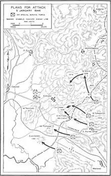 For the first four days the American attack stalled at the river line, the infantry unable to capitalise on their gains until 29 January when the US 168 Infantry Regiment found a weak spot and managed to get tanks across in greater numbers.[58] Working in tandem, the American tanks suppressed the German bunkers, allowing the infantry to overrun the German positions in the valley and push on to the low hills, taking the village of Caira[59] and capturing the staff of 1 Battalion, 131 Infantry Regiment into the bargain.[60]