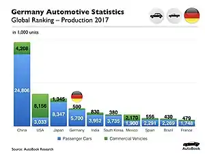 Currently, five German companies and seven marques dominate the automotive industry in the country: Volkswagen AG (and subsidiaries Audi and Porsche), BMW AG, Daimler AG, Adam Opel AG and Ford-Werke GmbH. Nearly six million vehicles were produced in Germany in 2014 though that fell to 3.7 million by 2020, and approximately 5.5 million are produced overseas by German brands.[15] Alongside the United States, China and Japan, Germany is one of the top 4 automobile manufacturers in the world. The Volkswagen Group is one of the three biggest automotive companies in the world (along with Toyota and General Motors).