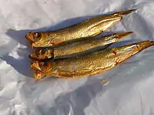 Fish fingers, known as Fischstäbchen (lit.: "fish sticklets"),[15] are a popular processed food made using whitefish such as cod, haddock or pollock, which has been battered or breaded.