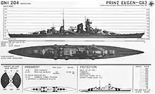 Prinz Eugen (German pronunciation: [ˈpʁɪnts ɔʏˈɡeːn]) was an Admiral Hipper-class heavy cruiser, the third of a class of five vessels. She served with Nazi Germany's Kriegsmarine during World War II. The ship was laid down in April 1936, launched in August 1938, and entered service after the outbreak of war, in August 1940. She was named after Prince Eugene of Savoy, an 18th-century general in the service of Austria. She was armed with a main battery of eight 20.3 cm (8 in) guns and, although nominally under the 10,000-long-ton (10,160 t) limit set by the Anglo-German Naval Agreement, actually displaced over 16,000 long tons (16,257 t).