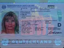 The page ends with a 2-line machine readable zone, according to ICAO standard 9303. The country code is not DEU as is the standard country code for Germany (according to ISO 3166-1 alpha-3), but D. This is the only country/citizen code which does not consist of 3 letters.