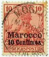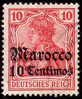 German post offices in Morocco (German: Deutsche Post in Marokko) started to operate in 1899. German definitive stamps were used with overprints; after the first issue the value was changed to pesetas and centimos. German post offices closed in French-controlled Morocco in 1914, and in Spanish-controlled Morocco and Tangier in 1919.[4][5]