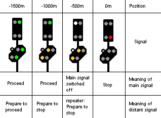 The main aspects are displayed along with the current distant aspect (or green light if signal has no distant function). Additional light bars consist of (usually) four yellow or green lights in a horizontal row.
