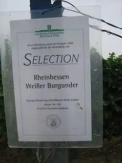 - A wine made from hand-picked, fully ripe grapes (min. 90° Oechsle) originating in a single vineyard in Rheinhessen. The grapes have to be typical to the region (Silvaner, Riesling, Weißburgunder, Grauburgunder, Gewürztraminer, Portugieser, Frühburgunder or Spätburgunder) and the wine must pass a sensory test.[20]