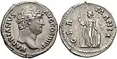 The figure of Germania appeared in Roman times, usually on coins, at first as a captive Amazon subdued by the Romans.[4] Sometimes, however, she appeared in a more dignified form as manifestation of a more integrative imperial ideology. For example, she was depicted with the attributes of Minerva on a coin in the reign of Hadrian.[5]