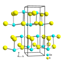 Germanium monosulfide or Germanium(II) sulfide is the chemical compound with the formula GeS. It is a chalcogenide glass and a semiconductor.[1] Germanium sulfide is described as a red-brown powder or black crystals.[2] Germanium(II) sulfide when dry is stable in air, hydrolyzes slowly in moist air but rapidly reacts in water forming Ge(OH)2 and then GeO.[3] It is one of a few sulfides that can be sublimed under vacuum without decomposition.[4]