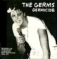 Germicide, also known as Germicide: Live at the Whisky, 1977,[1] is a live album by the punk rock band the Germs. Performing live at the Whisky a Go Go in 1977, Darby Crash and the Germs were at the beginning of their career. At this time, Crash performed using the name Bobby Pyn. Darby and the audience feud constantly throughout the show. Disc jockey Rodney Bingenheimer appears at the beginning as master of ceremonies, and the band's former drummer Dottie Danger (Belinda Carlisle) briefly takes the mic to introduce the band, who she describes as "sluts".