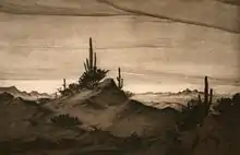 Peirce established a print atelier in Tucson in 1934.[2] The studio, known as “The Print Room,” was originally located in “Governor’s Corner” at 158 North Court Street, was relocated to Charles O. Brown House in the early 1940s. He called the building the “Old Adobe,” a name that stuck for decades. Arizona transformed his work. Peirce turned to the desert for inspiration, his prints capturing the tonality and stark grandeur of the Sonoran desert. His compositions are infused with solace, dignity, and the ethereal beauty of the west.[3] In 1939, in partnership with his friend and contemporary Stanford Stevens, he illustrated the publication “Plants of Sun and Sand.”[4] His prints gradually gained national recognition. His work is accessioned into the permanent collection of institutions including the Metropolitan Museum of Art, Boston Museum of Fine Art, Cleveland Museum of Art, Library of Congress, the Smithsonian and Harvard's Fogg Museum.