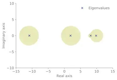 The eigenvalues are 9.8218, 8.1478, 1.8995, −10.86. Note that this is a (column) diagonally dominant matrix: . This means that most of the matrix is in the diagonal, which explains why the eigenvalues are so close to the centers of the circles, and the estimates are very good. For a random matrix, we would expect the eigenvalues to be substantially further from the centers of the circles.