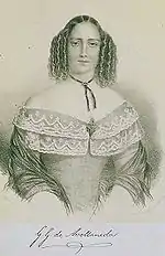 In the province of Seville in Andalusia she visited Constantina, where her father's family lived.[18] In 1839, shortly after her arrival in Seville, she met and fell deeply in love with Ignacio de Cepeda y Alcalde, a wealthy, well-educated, and socially prominent young man.[19] The first man that Avellaneda had a loved was Ignacio de Cepeda, who was the focus of many of her writings, mainly love letters. (There were forty love letters total, spanning from 1839 until 1854. After his death, his widow inherited and published them.) She also wrote him an autobiography in July 1839. Biographers of Avellaneda have relied too heavily on this account for information about her early life, as it was written for a specific purpose: to make a good impression on Cepeda.[8] For example, she said that she was younger than she really was because Cepeda was two years younger than her, and she wanted to make herself look as young as possible.[20][lower-alpha 3] Because of the over-reliance on this biased source, few details are known for certain about the first 22 years of her life.[3] The autobiography written to Cepeda was the second of the four autobiographies she wrote during her lifetime; the other three were written in 1838, 1846, and 1850, respectively.[21] Though she loved Cepeda very much, he did not want to pursue a marriage with her. One reason he gave was that she was not rich enough. He also gave reason that she was not feminine enough stating that she was more verbal than should be and was often too aggressive for a woman of the 19th century. After her relationship with Cepeda ended, she went to Madrid.