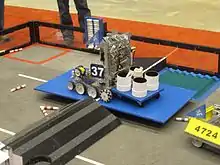 The field is twelve feet long by twelve feet wide.[6] Alliance stations are on opposite sides There are two zones, one for the Blue Alliance and another for the Red Alliance. The scoring objects are on the opposite side of the field relative to the alliance that will use them to score; that is, the Red Alliance's batons are in the Blue Alliance's zone and Blue Alliance's batons are in the Red Alliance's zone. Across the center of the field, there are several obstacles. At the very middle of the field is a traversable mountain, and on each side of it are balanced bridges, one red and one blue. Next to each bridge on the side opposite to the mountain is a cliff and a corrugated goal.[5]