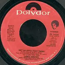 "Get Up Offa That Thing" is a song written and performed by James Brown. It was released in 1976 as a two-part single (the B-side, titled "Release the Pressure", is a continuation of the same song). It reached #4 on the R&B chart, briefly returning Brown to the Top Ten after a year's absence, and #45 on the Billboard Hot 100.[1][2] Thanks to its chart success, the song became Brown's biggest hit of the late 1970s. The song's lyrics urge listeners to "Get up offa that thing / and dance 'til you feel better." Due to his troubles with the IRS for failure to pay back taxes, Brown credited authorship of the song to his wife Deidre and their daughters, Deanna and Yamma Brown.
