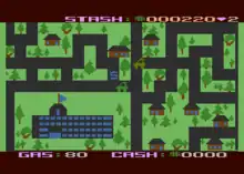 The more money being carried—displayed as "CASH" below the scrolling maze—the more aggressive the three different police vehicles are. If the player is caught, any cash is lost as well as one of the player's three cars. Cash is locked-in by dropping it off at the hideout, where it becomes part of the permanent stash (shown at the top of the screen) and causes the police to lose interest.[5] This can be done at any time. As the game progresses, police begin setting up roadblocks and stop signs. Hitting a roadblock (a dark yellow “X”) puts a hole in the gas tank, causing it to drain quickly until stopping at a gas station. Running a stop sign (an octagon which blinks on and off) causes all of the cash being carried to be lost.