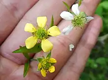 Geum ×catlingii (centre), with parents G. canadense (top right), and G. urbanum (bottom centre)