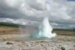 Eventually the water remaining in the geyser cools back to below the boiling point and the eruption ends; heated groundwater begins seeping back into the reservoir, and the whole cycle begins again. The duration of eruptions and time between successive eruptions vary greatly from geyser to geyser; Strokkur in Iceland erupts for a few seconds every few minutes, while Grand Geyser in the United States erupts for up to 10 minutes every 8–12 hours.[8]