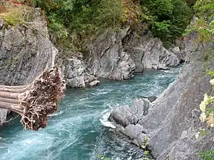 The route begins at Whiskey Bend Trailhead, at the end of Whiskey Bend road, approximately 5 miles from the Elwha Ranger Station. It travels for about 1.3 miles along the Elwha River trail, before the first descent down approximately 400 feet to Goblins Gate at the head of Rica Canyon. The trail continues along the Elwha River through a riparian forest of bigleaf maple, red alder, black cottonwood, with Douglas fir, Western red cedar, and Grand fir.
