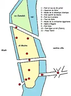Gezira is west of downtown Cairo and Tahrir Square, connected across the Nile by four bridges each on the east and west sides, the Qasr El Nil Bridge, 15 May Bridge, Al-Gala'a Bridge and 6th October Bridge. Under 19th century ruler Khedive Ismail the island was first called "Jardin des Plantes" (French for "Garden of Plants"), because of its great collection of exotic plants shipped from all over the world.[1]