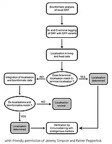 Results from the N- and C-terminal fusions are assessed and in turn these data are compared to the bioinformatic predictions. A final subcellular localisation (from approximately 20 categories) is then assigned for each ORF. Similar localisations with both N- and C-terminal constructs provide a higher degree of reliability of the result. For those ORFs where the two fusions do not give a similar localisation pattern, a series of other criteria, including bioinformatic predictions, are considered. Occasionally a clear cut localization cannot be assigned.