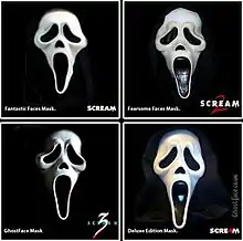 The 1991–92 "Fantastic Faces" edition of the mask used in Scream is made of thin, white rubber with blackened eyes, nose, and mouth. Despite being fictionally a character in the movie cast, in the first, second, and fourth films, the costume was most often worn by stunt performer Dane Farwell, who gave the character specific characteristics such as cleaning the knife after killing, also giving the stature and a unique movement to the character.[19] In the first film, Craven wore the costume during the opening murder scene, where the character is struck by a phone, and by Ulrich only once during a finale scene, where the character prepares to murder Randy.[19] Despite Stu wearing the costume in the film, actor Lillard never actually wore the outfit.[19] Scream 2 features a slightly redesigned version of the mask from the "Fearsome Faces" line, possessing slightly-altered eyes and an indented chin.[24] Following Scream 2, the Ghostface mask became part of the "Ghostface" line of masks featuring several variations of the design including glow-in-the-dark models.[24] The plain, white version of the Ghostface line mask is used in Scream 3 by Bridger.[24] Another edition of the mask was developed for use by Ghostface in Scream 4, dubbed "The Deluxe Edition Mask"; again, similar to the original Ghostface design, but constructed of thicker rubber with a pearlescent finish.[24]