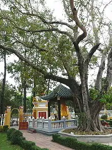 Immediately upon entering through the main gate is the garden, which is dominated by a large statue of the bodhisattva Avalokiteshvara under a tall and healthy bodhi tree, a species of which Prince Siddhartha sat under while gaining enlightenment to become Gautama Buddha. The tree present in the garden was brought to Vietnam from Sri Lanka by the famous 20th Sinhalese Theravada Buddhist monk Narada, known for his worldwide efforts in propagating the dharma. The tree arrived on June 18, 1953, and was also accompanied by the arrival of a sample of the relics of Gautama Buddha.[1]