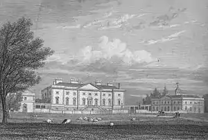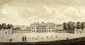 The house was to have similarities with one of Leoni's more ambitious projects, Lathom House. Both were similar in concept to Andrea Palladio's never-built Villa Mocenigo, with great spreading and segmented colonnaded wings embracing a cour d'honneur. Today, the wings have been demolished but the square corps de logis remains.[14]