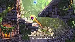 Beginning production in early 2011, Black Forest Games was initially shopping the game around to various publishers, the conditions put on the developer in order for the game to see a release was deemed unfavorable, and required a lot of content to be cut.[5] The newly-assembled team was eager to break away from the public perception that the franchise is only known as a copycat of Super Mario Bros., and sought to change it by creating a unique modern platforming game with high production values and original game mechanics.[8] One of the most important aspects of the very first Giana Sisters was the ability to transform into a "punk" variation by picking up the ball item, and this became the basis for Project Giana.[8]