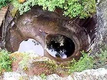 A giant's kettle, also known as either a giant's cauldron, moulin pothole, or glacial pothole, is a typically large and cylindrical pothole drilled in solid rock underlying a glacier either by water descending down a deep moulin or by gravel rotating in the bed of subglacial meltwater stream.[1]