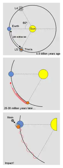 The giant-impact hypothesis, sometimes called the Big Splash, or the Theia Impact, suggests that the Moon was formed from the ejecta of a collision between the early Earth and a Mars-sized planet, approximately 4.5 billion years ago in the Hadean eon (about 20 to 100 million years after the Solar System coalesced).[1] The colliding body is sometimes called Theia, named after the mythical Greek Titan who was the mother of Selene, the goddess of the Moon.[2] Analysis of lunar rocks published in a 2016 report suggests that the impact might have been a direct hit, causing a fragmentation and thorough mixing of both parent bodies.[3]
