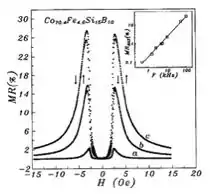 - Machado; et al. (1994-05-15). "Giant ac magnetoresistance in the soft ferromagnet Co70.4Fe4.6Si15B10". Journal of Applied Physics. 75 (10): 6563–6565. Bibcode:1994JAP....75.6563M. doi:10.1063/1.356919. ISSN 0021-8979.