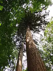 The thicker of the over 40 metre high giant sequoias has a trunk diameter of over 2 metres at a height of one metre above the ground.[2] Under estate owner, Julius Hüniken, and his estate forester, Heinrich Hagge, the estates were afforested in the 1870s. Hüniken was a member of the Mecklenburg Society of Foresters (Verein Mecklenburgischer Forstwirte). As a result of his interest in dendrology, rare trees were also planted, such as these giant sequoias, otherwise native in North America on the western slopes of the Sierra Nevada in California.[5]