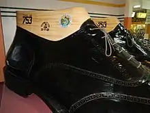Marikina's giant shoes were made by Colossal Footwear, a 9-shoemaker team consisting of Norman Arada, Florinio de Asis, Daniel Cotter, Noel Cox, Arman Javier, Cesar Paz, Arthur Rivera, Emmanuel Samson, and Romel Villareal.[1][2] They decided to make a pair of men's shoes for stability and were hesitant of making high-heeled women's shoes. Bulacan-based The Valenzuela Tannery was responsible for supplying the natural leather used for the making of the giant shoes. The shoes, which has a size of 753 according to French shoe size standards, took 77 days of crafting to be finished. The shoes costed ₱1.2 million (US$23,076) and each has a dimension of 5.5 m × 2.35 m × 1.83 m (18.0 ft × 7.7 ft × 6.0 ft)[1] The footwear are Oxford shoes.[2]