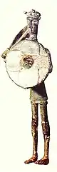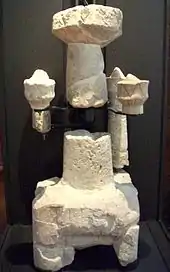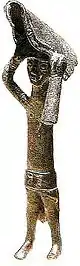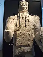 Some scholars have cast doubts about the original pertinence of the latter to the necropolis, in that the only evidence in favour of this fact would be the spatial contiguity between the statues and the mortuary complex itself.[56] This led others to hypothesize that the statues had been conceived as telamons to adorn a temple, close to the necropolis, but dedicated to the Sardus Pater. According to this theory, the temple with statues would have been erected to commemorate nuragic victories against the Carthaginian invaders, during the sardo-punic wars.[63][64] In this case, the statues would have portrayed the retinue or the bodyguards of the deity.[63]