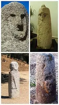 An intermediate stage of this process could be represented by the appearance of hammered relief sculptures during the Middle Bronze Age – in both Sardinia and Corsica: in the former country, baetyls were engraved with male or female gender characters in relief, while in the latter – perhaps due to the greater presence of metal implements – relief sculpture was applied for the first time to menhirs. In both islands, anthropomorphic statuary in the strict sense of the word would not exist between 1600 and 1250 BC, but gender characteristics and weapons were represented in Sardinia and Corsica respectively.[23] In a successive evolution stage, the relief technique was employed in Sardinia – for the first time after Eneolithic sculptures – to represent a human face, as shown in the famous baetyl of "San Pietro di Golgo" (Baunei).[25][26][27]